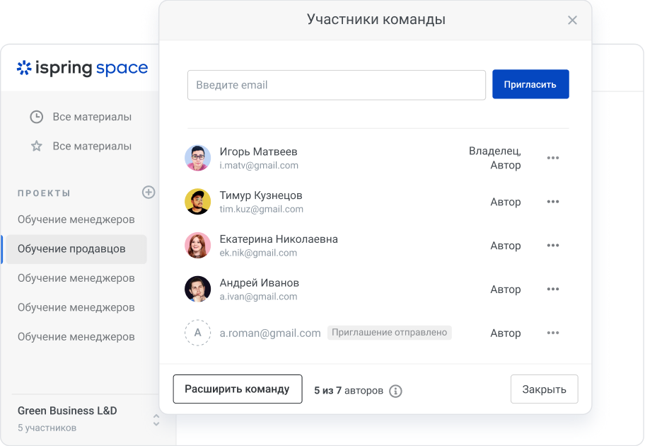 Онлайн-сервис для командной работы над курсами. Чтобы ускорить работу, загрузите курс в iSpring Space и отправьте ссылку коллегам. Они помогут исправить тексты, настроят дизайн курса, добавят тесты, тренажёры или смонтируют видео. Достаточно просто войти в аккаунт Space с любого устройства