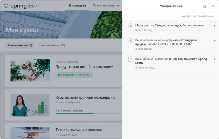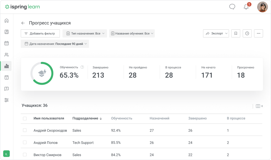 iSpring Learn возьмет на себя всю рутину: отправит уведомление о назначении курса, напомнит о скором дедлайне и соберет отчет по результатам