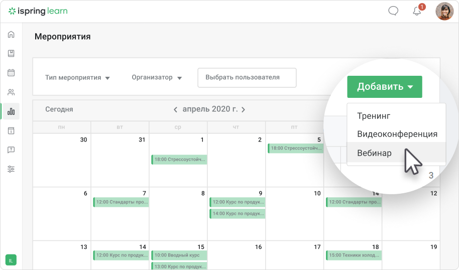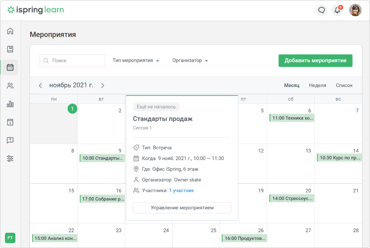В систему можно внести информацию не только о вебинарах и онлайн встречах, но и об очных тренингах. Так, сотрудники не упустят важное мероприятие и успеют спланировать свой график
